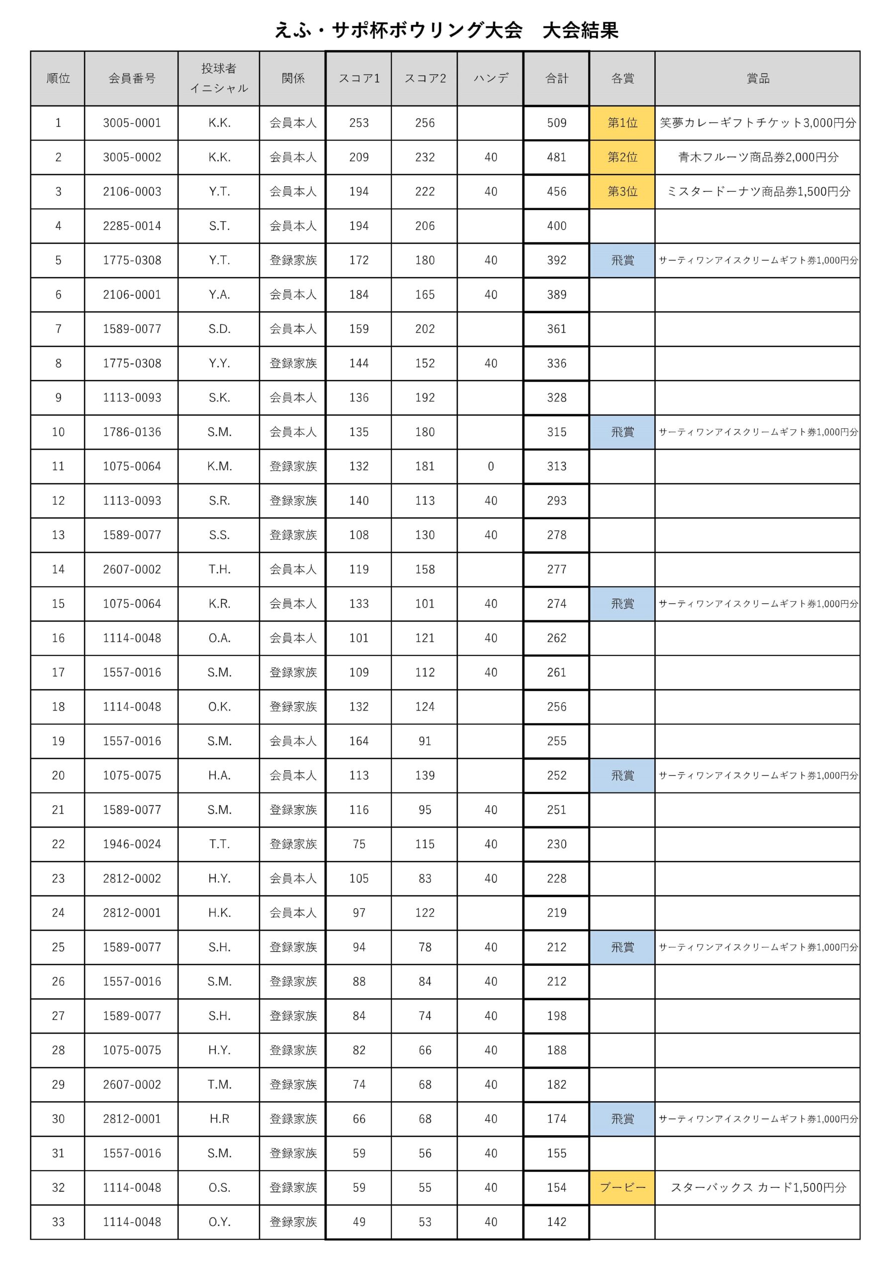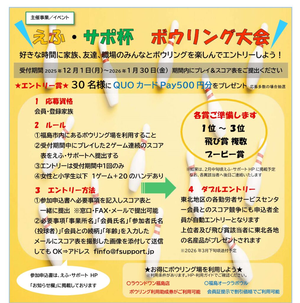 2か月にわたる日程でスコア表提出方式による「えふ・サポ杯ボウリング大会」を開催しました。33名の方にご参加いただき、大会結果につきましては下記のとおりとなります。入賞者の皆様おめでとうございます🎉なお、エントリー賞及び入賞賞品の受取につきましては、改めて該当の皆様へご連絡をいたします✉